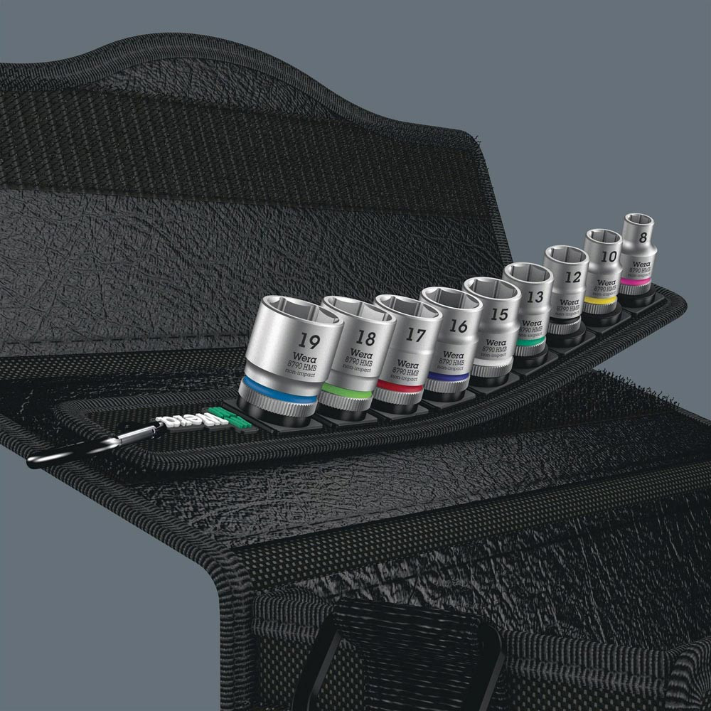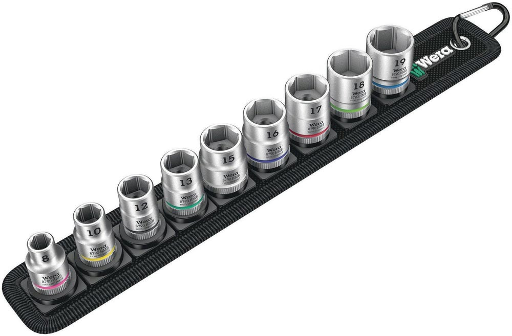 Außen-6-kant · robuster Textilgurt (Belt) im typischen Wera Design mit 9 Nüssen auf engstem Raum · leichtgängiger Drehmechanismus sorgt für einen sicheren Halt und leichte Entnahme der Nüsse · mit ″Take it easy″ Werkzeugfinder mit Farbkennzeichnung nach Größen - zum einfachen und schnellen Finden des benötigten Werkzeugs · inklusive Karabinerhaken zur Befestigung an Gürtelschlaufen oder Taschen · mit Vliesrücken und Klettklebestreifen zur einfachen Befestigung z.B. an Wand, Regal, Werkstattwagen und Wera 2go Werkzeugtransportsystem