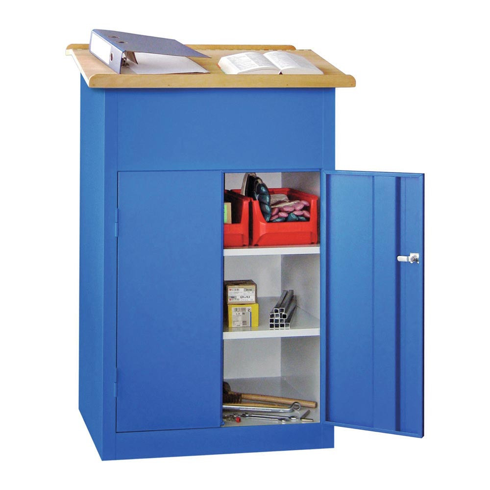 · Höhe vorne: 1100 mm, Höhe hinten: 1200 mm · Mit 2 festen Fachböden, sowie fest verschweißtem Pult, in dem sich ein ca. 200 mm tiefer Boden befindet ∙ Die Türen mit Verstärkungstaschen sind gemeinsam durch Zylinderschloss verschließbar ∙ Alle Stahlteile sind pulverbeschichtet · Aufklappbarer Deckel aus Tischlerplatte, geölt, mit Abrollkante vorne und hinten