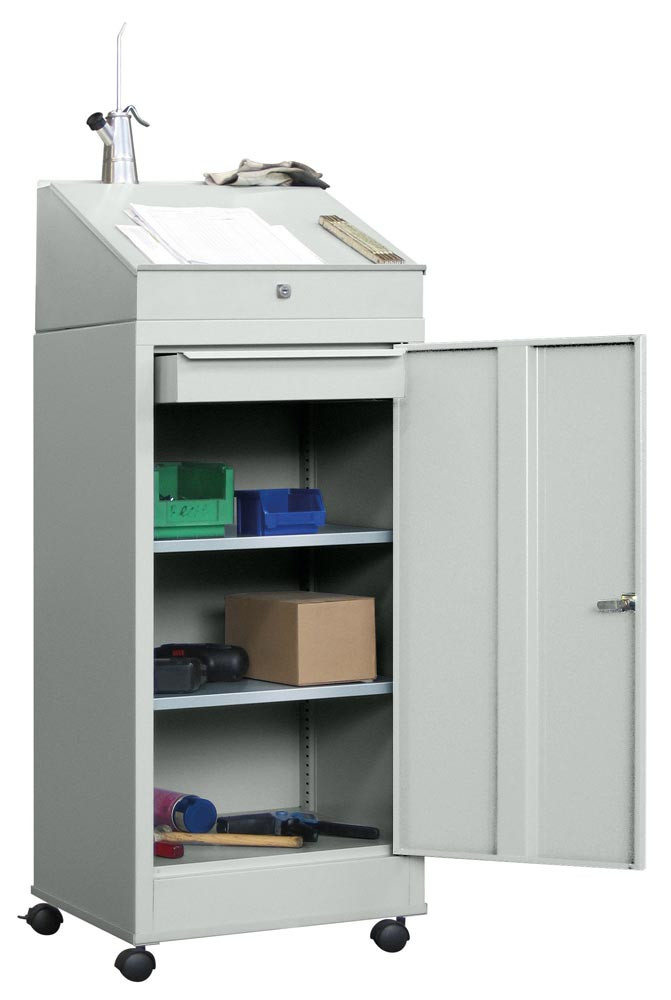 Stehpult fahrbar, BxTxH 500x500x1000/1330 mm, 2 Böden, 1 Schublade, RAL 7035 E1577384