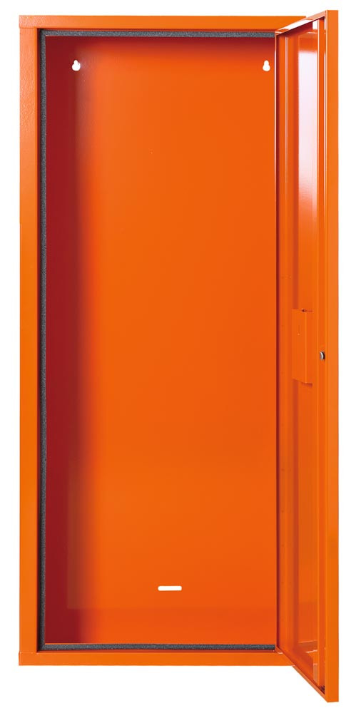∙ Aus Qualitäts-Feinblech ∙ Orange lackiert ∙ Eintürig ∙ Verschließbar ∙ Umlaufende Dichtung ∙ Notschlüsselfach mit Glasabdeckung ∙ Siebdruck und Farbpiktogramme ∙ Wahlweise gefüllt oder leer lieferbar