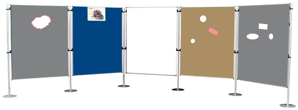 · Wandelemente mit umlaufendem Aluminiumrahmen · Vertikal oder horizontal einhängbar · Höhenverstellbar mit verschiebbaren Metallhaken · Stative in verschiedenen Ausführungen und 2 Höhen als Zubehör wählbar
