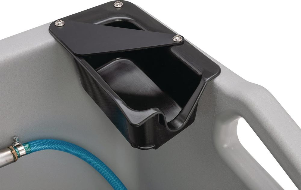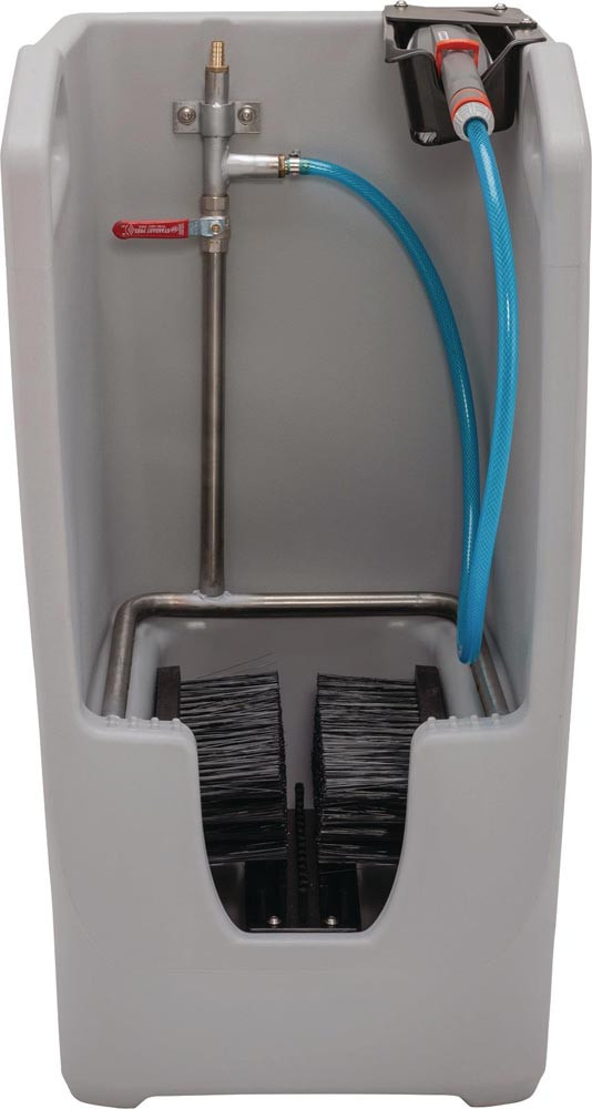 gefertigt aus robustem und alterungsbeständigem Polyethylen · ausgestattet mit drei festen und einer beweglichen Handbürste · Wasseranschluss 12,70 mm (½“), Leitungen aus Edelstahl · Bürstenhalter mit integrieter Handwaschfunktion · mit integrierter Sammelwanne zum Sammeln und Ableiten des ablaufenden Schmutzwassers IG 1 1/2″, wahlweise rechts oder links · max. Betriebsdruck 6 bar · max. Wassertemperatur +40 °C