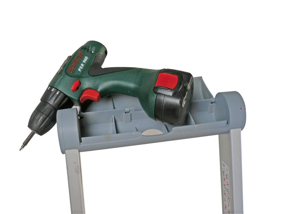 Stufen-Stehleiter, einseitig begehbar, Ablageschale mit Deckel + Eimerhaken 25 kg Traglast, senk. Höhe 1480 mm, 4 Stufen, Gewicht 4,9 kg E490611