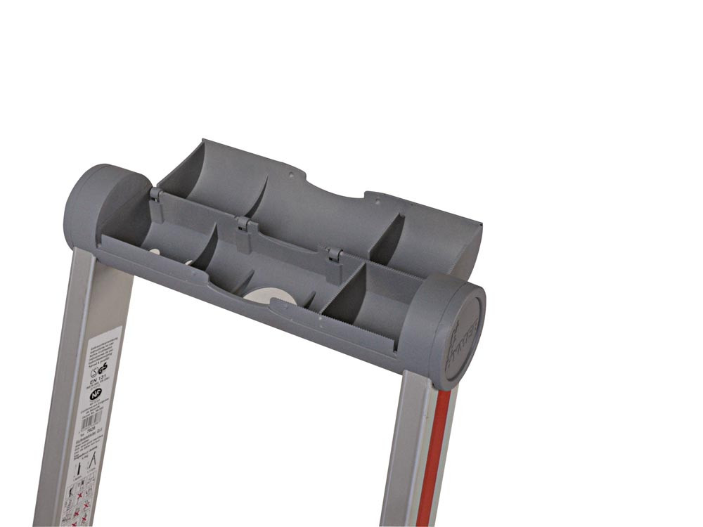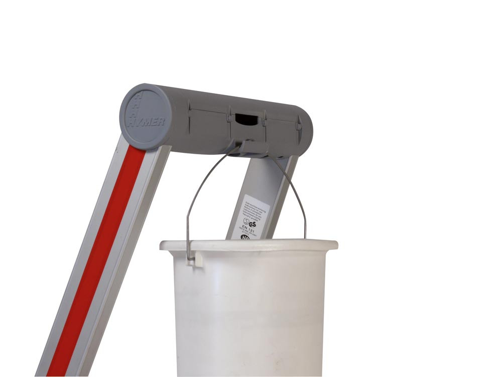 ∙ Stabile Aluminium Ausführung ∙ Einseitig begehbar ∙ Geräumige Ablageschale aus hochfestem Kunststoff mit Deckel und Eimerhaken (25 kg Traglast) ∙ Rutschhemmende Schuhe mit vergrößerter Auflagefläche ∙ Stufen vorn mit Holm bündig und hinten abgerundet, daher keine scharfen Kanten ∙ Konische Bauform ∙ Eloxierte Holme