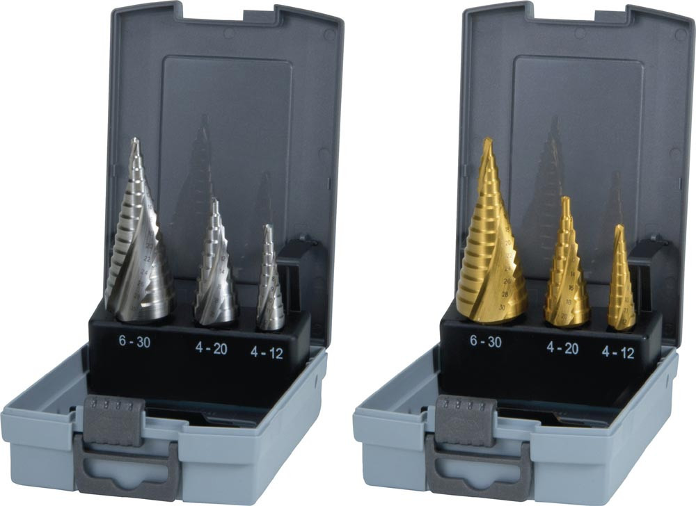 Stufenbohrersatz Ø 4-12/4-20/4-30 mm HSS-Co5 spiralgenutet 3 teilig Kunststoffkassette