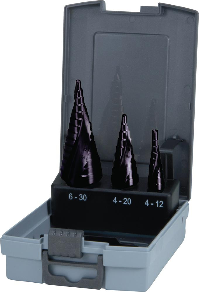 Stufenbohrersatz Ø 4-12/4-20/4-30 mm HSS-TIALN spiralgenutet 3 teilig Kunststoffkassette