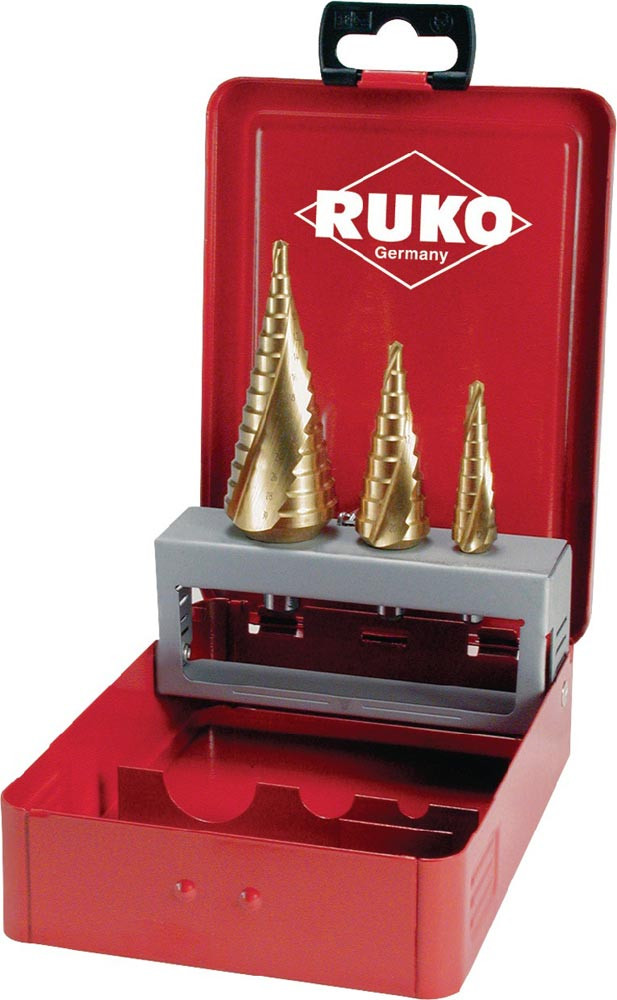 Stufenbohrersatz 4-12/4-20/4-30 mm HSS-TiN spiralgenutet 3-teilig Metallkassette E6436872