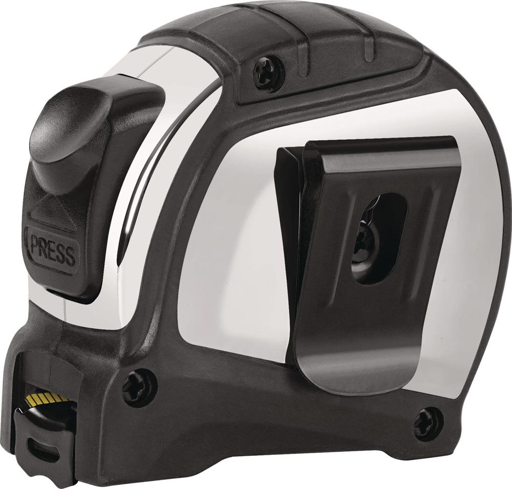 Stahlband mattgelb lackiert · Aufdruck mit beidseitiger Band-Graduierung · eine Seite horizontal, eine Seite vertikal · Selbst-Arretierungs-System (Rücklauf auf Tastendruck) · Länge 5 m und 8 m mit Doppelendhaken · verchromtes Kunststoffgehäuse mit Teil-Gummiüberzug und Gürtelclip · EG-Genauigkeitsklasse II