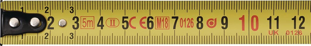 Stahlband gelb lackiert · automatischer Bandrücklauf mit Feststeller · verchromtes Kunststoffgehäuse mit Gürtelclip · EG-Genauigkeitsklasse II