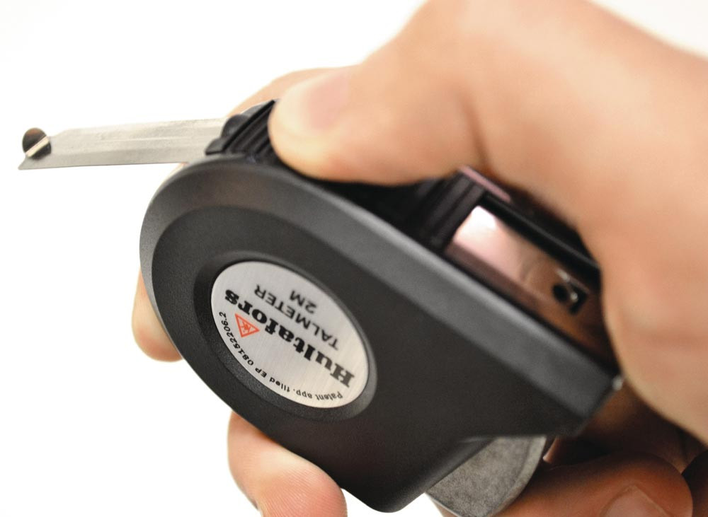 mit automatischer Arretierung · für Innen- und Außenmessungen · für Schlosser und Tischler · mit ausklappbarer Messlasche für einfache Innenmessung · mit Anreiß-Spitze · schwarzes ABS-Gehäuse · weißes Stahlband · EG-Genauigkeitsklasse II
