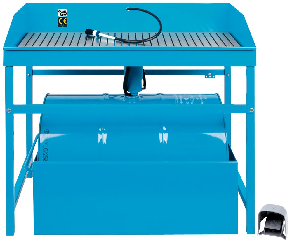 Teilereinigungsgerät, BxTxH 1145x670x1050 mm, Traglast 250 kg, Set mit Auffangwanne und Reiniger Purgasol 200-l Fass, Arbeitshöhe 870 mm