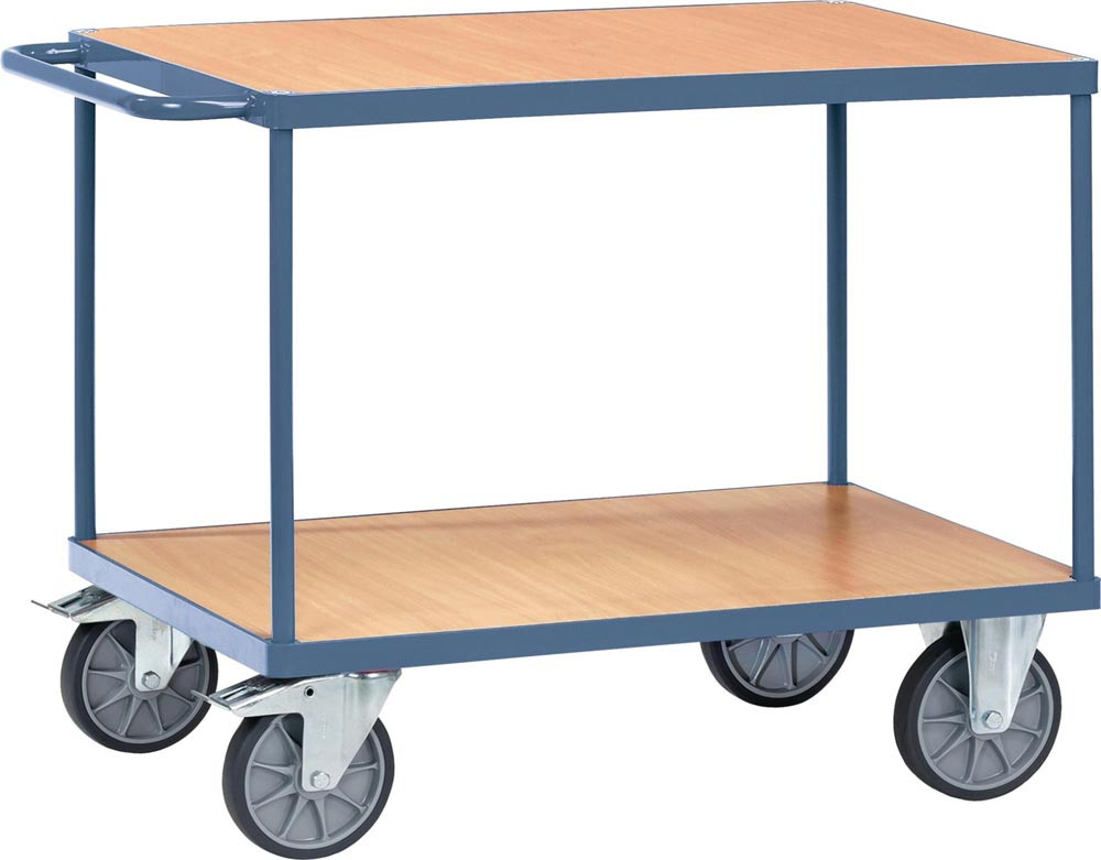Stahlrohr und Profilstahl geschweißt · pulverbeschichtet saphirblau, RAL 5003, dauerhaft oberflächengeschützt, schlag- und kratzfest · Ladeflächen aus Holzwerkstoffplatten, Oberfläche Buchedekor · 2 Lenkrollen mit Feststeller und 2 Bockrollen, TPE-Bereifung · Naben mit Rillenkugellager · Tragfähigkeit obere Ladefläche 200 kg · Zerlegte Anlieferung · Anwendung: