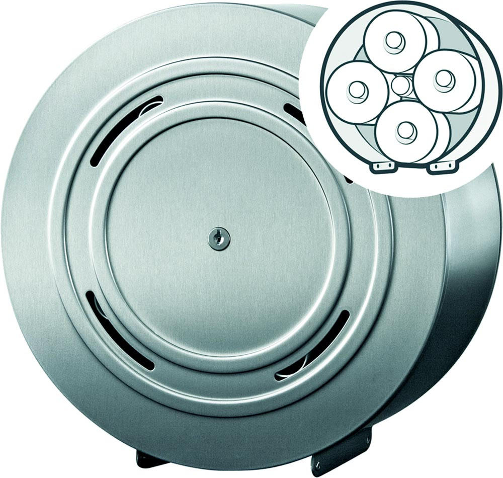 ∙ Quattro-Toilettenpapierspender für Normalrollen ∙ Mit Abrisskante und Füllstandanzeige ∙ Abschließbar ∙ Geeignet für vier kleine Toilettenpapierrollen mit einem Durchmesser von bis zu 135 mm ∙ B x T x H 320 x 125 x 320 mm