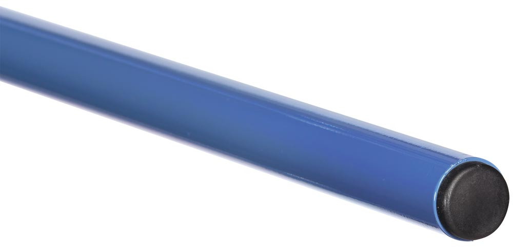 · Baukasten-System · Rahmen aus stabilem Quadratrohr · Rollen-Traversen, Pfosten und Streben durch kräftige Schraubschellen verbunden · Tragarme aus Stahlrohr Ø 27 mm mit Schraubschellen · Pulverbeschichtet RAL 5007 brillantblau · 2 Lenk- und 2 Bockrollen · Feststeller an den Lenkrollen · TPE-Bereifung · Naben mit Rillenkugellager