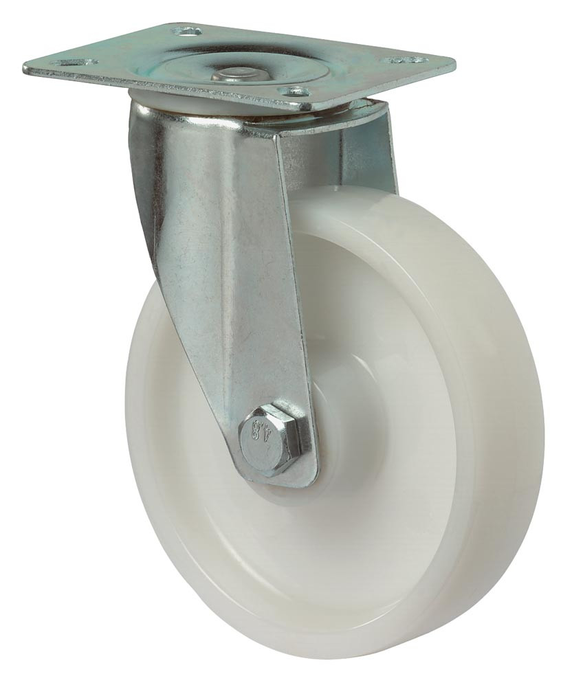 Transportgeräte-Lenkrolle, Kunststoff weiß, Durchm. 100 mm, Traglast 125 kg, Rollenlager, Anschraubplatte E1617756