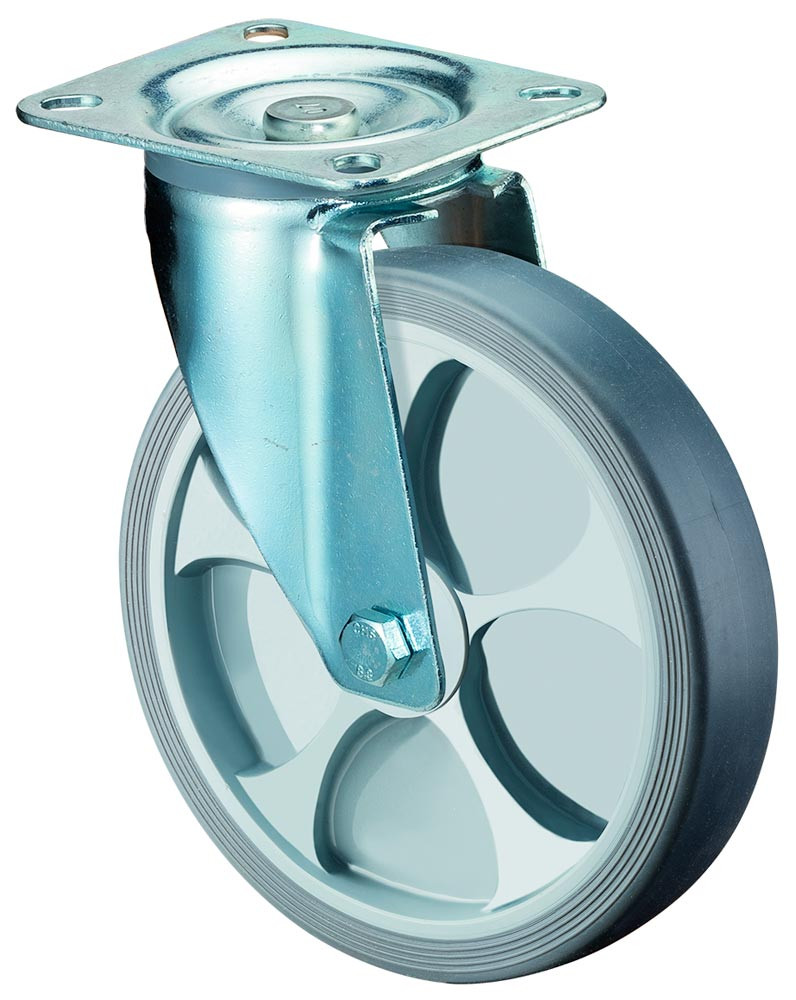 Transportgeräte-Lenkrolle, thermopl. Gummi grau, Durchm. 100 mm, Traglast 110 kg, Rollenlager, Anschraubplatte E6017306