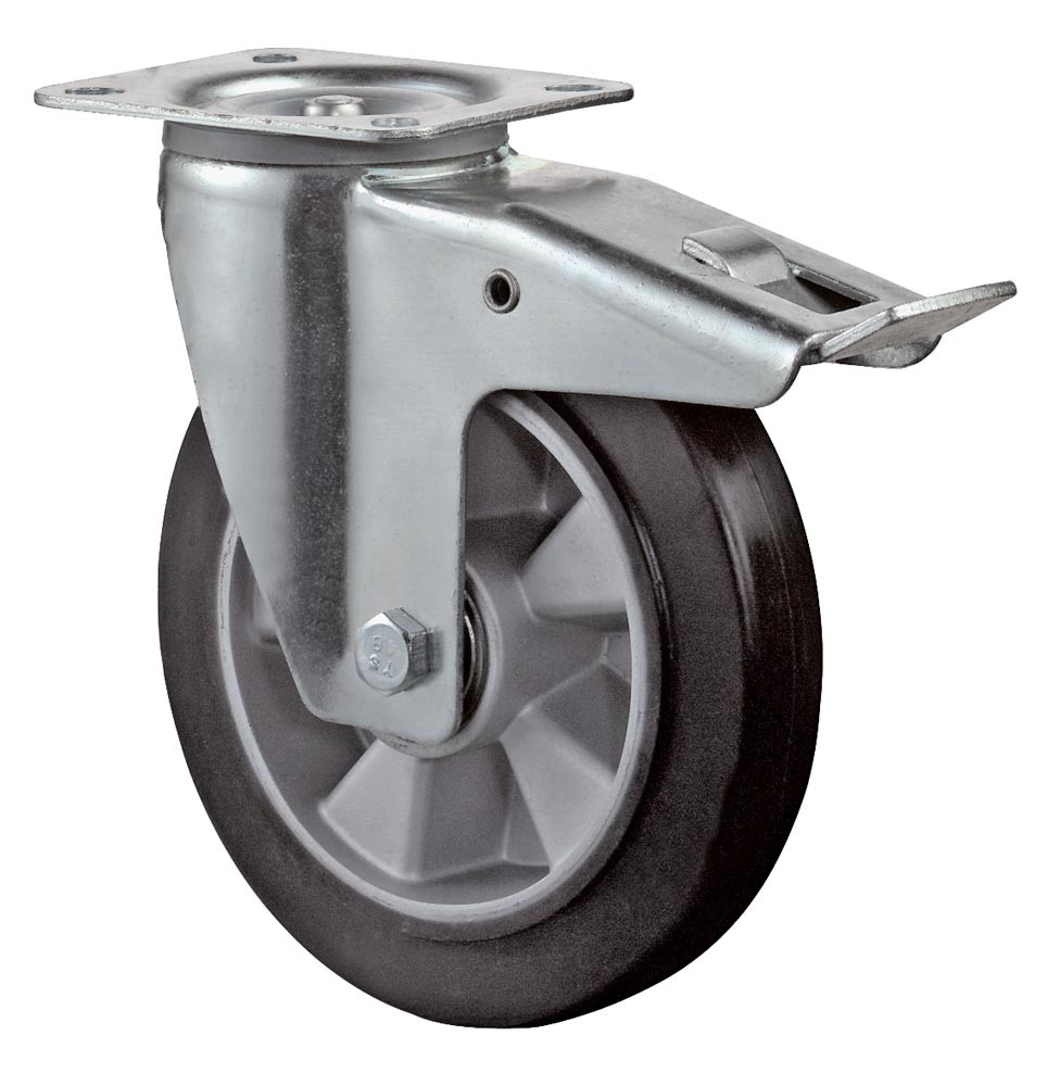 Transportgeräte-Lenkrolle m. Festst., Elastik-Vollgummi schwarz, Durchm. 100 mm, Traglast 150 kg, Kugellager, Anschraubplatte E1617821