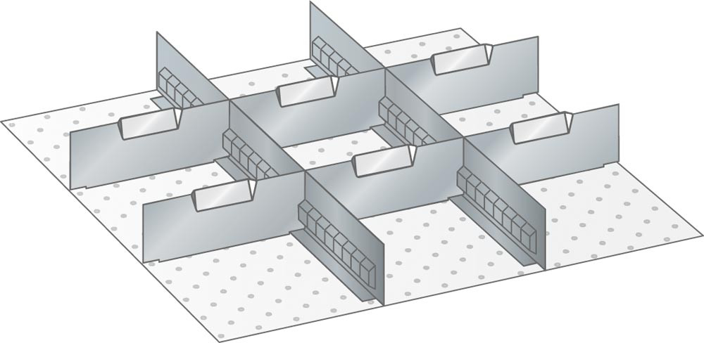 Trennwände, Fronthöhe 150 mm, 2 Schlitzwände 27E, 6 Trennbleche 9E, Schubladennutzgröße BxT 459x459 mm