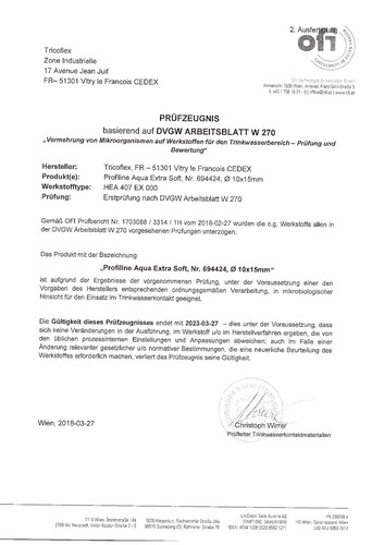 Zulassung: KTW-Leitlinie des Umwelbundesamtes nach Kat. "A" und dem DVGW Arbeitsblatt W270