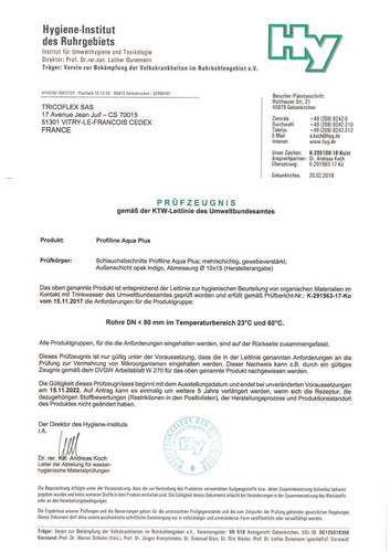 mehrschichtiger Schlauch für den Trinkwasserbereich · mit Polyesterfadeneinlage und einer Polyethylen-Innenseele · blaue Decke · KTW A und DVGW-W270-geprüft · zugelassen nach der europäischen Richtlinie für den Kontakt mit Lebensmitteln 2007/19 CE in der Kategorie A/B/C/D und für Olivenöl X und Xb (VO 10/2011-konform) · zugelassen auch für Milch nach EU Verordnung Nr. 10/2011/EU, Prüfbericht K-291563-17 Ko (11/2017) des Hygiene-Institut des Ruhrgebiets gemäß der KTW-Leitlinie des Umweltbundesamtes