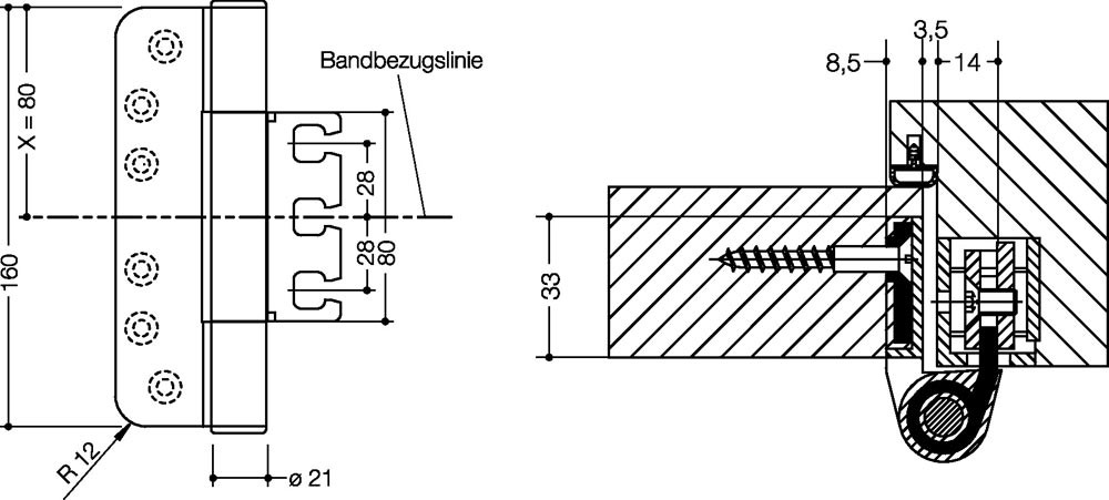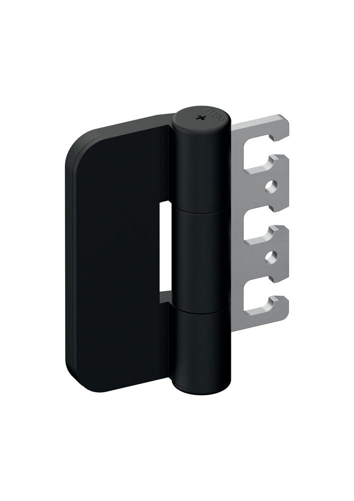 Dreirollenband für gefälzte Türen mit einem Gewicht bis zu 180 kg · aus mattem Polyamid mit tragenden Stahlgerüst · geschlossene Bandrolle · Bauhöhe 160 mm · Bandrollendurchmesser 21 mm · Edelstahlachse, DIN rechts und DIN links verwendbar · zur Montage an Holz-, Stahl- und Aluminiumtüren mit dreidimensional verstellbaren Aufnahmeelementen VX... und VZX... · Ausführungsvorschlag! Bitte alle Maße und baulichen Gegebenheiten im Auftragsfall prüfen!