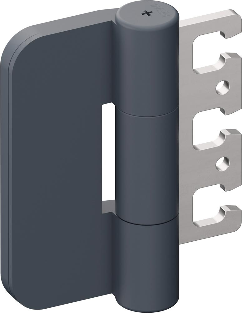 Dreirollenband für ungefälzte Türen mit einem Gewicht bis zu 100 kg, aus mattem Polyamid mit tragenden Stahlgerüst · geschlossene Bandrolle, Bauhöhe 100 mm · Bandrollendurchmesser 21 mm · Edelstahlachse · DIN rechts und DIN links verwendbar · zur Montage an Holz-, Stahl- und Aluminiumtüren mit dreidimensional verstellbaren Aufnahmeelementen VX... und VZX... · Ausführungsvorschlag! Bitte alle Maße und baulichen Gegebenheiten im Auftragsfall prüfen!