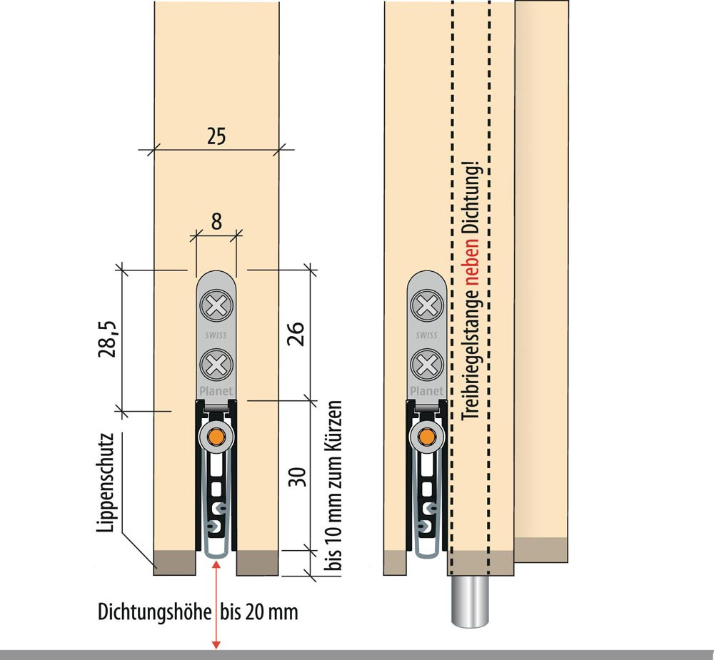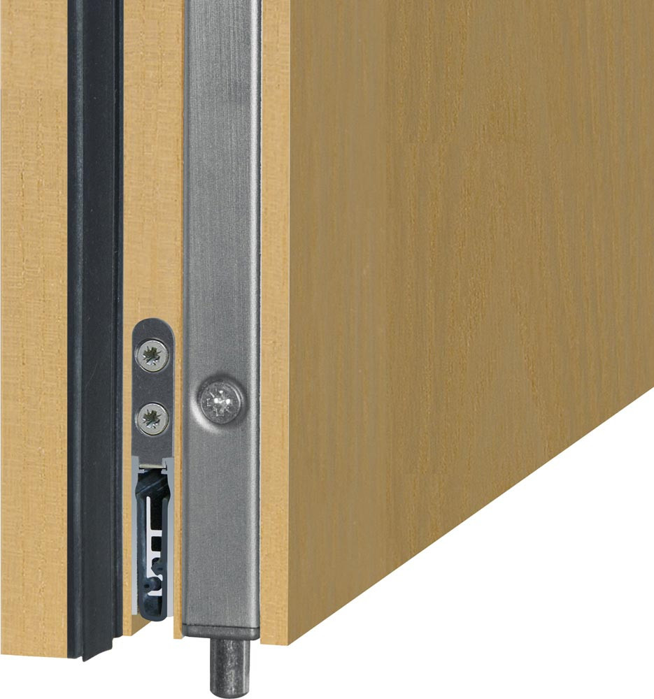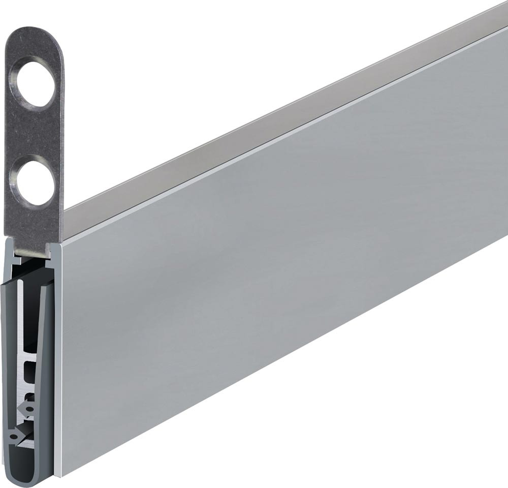 automatische Türabsenkdichtung FH+RD 48 dB · für besonders schmale Türen · für schall-, rauch- und feuerhemmende Türen · bandseitige einseitige Auslösung mit automatischem Ausgleich bei schiefem Boden · Parallelabsenkung · Dichtungshöhe bis 20 mm · zum Einnuten bündig oder tiefer mit Lippenschutz · kürzbar um 125 mm · seitliche Befestigung · Lippe aus selbstverlöschendem Silikon · Aluminium