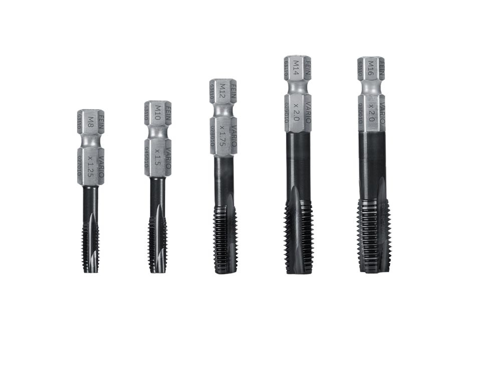 VARIO Gewindebohrer in 5 verschiedenen Größen für Durchgangslöcher ∙ Aus robustem HSS Material mit TiAlN Beschichtung (Titan-Aluminium-Nitrit) ∙ Hitzebeständig bis 800 °C und reibungsärmer dank exklusiver TiAlN Beschichtung ∙ Die FEIN VARIO Gewindebohrer sind nur in Kombination mit den FEIN Vario Adapter einsetzbereit