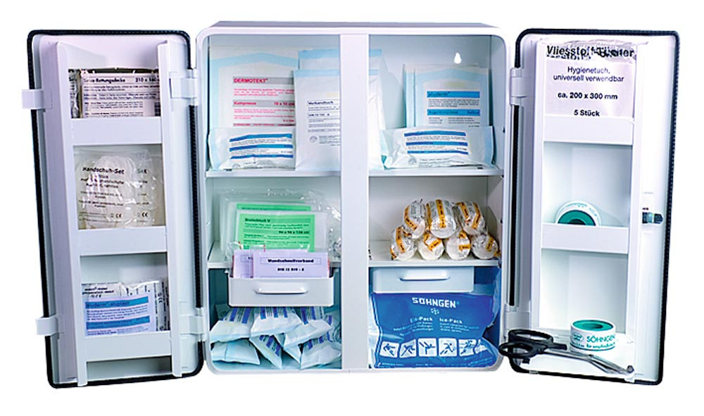 ∙ 404 x 462 x 170 mm ∙ Stahlblech weiß lackiert ∙ Zweitürig ∙ Verschließbar ∙ 2 Einlegeböden und 2 Schubladen ∙ Türen mit je 3 Ablageschalen ∙ Siebdruck und Piktogramme ∙ Komplett mit Füllung DIN 13169 ∙ Zusätzlich klappbares Ablagetableau zur hygienischen Zwischenlagerung von Verbandmaterial bei der Erste-Hilfe-Leistung