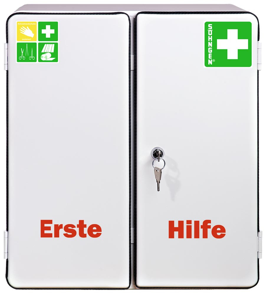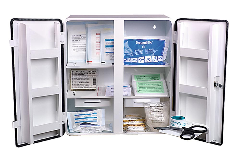 Aus Stahlblech, weiß lackiert ∙ Zweitürig ∙ Verschließbar ∙ 2 Einlegeböden ∙ 2 Schubladen ∙ 6 Türablagen ∙ Siebdruck und Piktogramme ∙ Komplett mit Füllung DIN 13157 ∙ Tür mit klappbarem Ablagetableau zur hygienischen Zwischenlagerung von Verbandmaterial bei der Erste-Hilfe-Leistung
