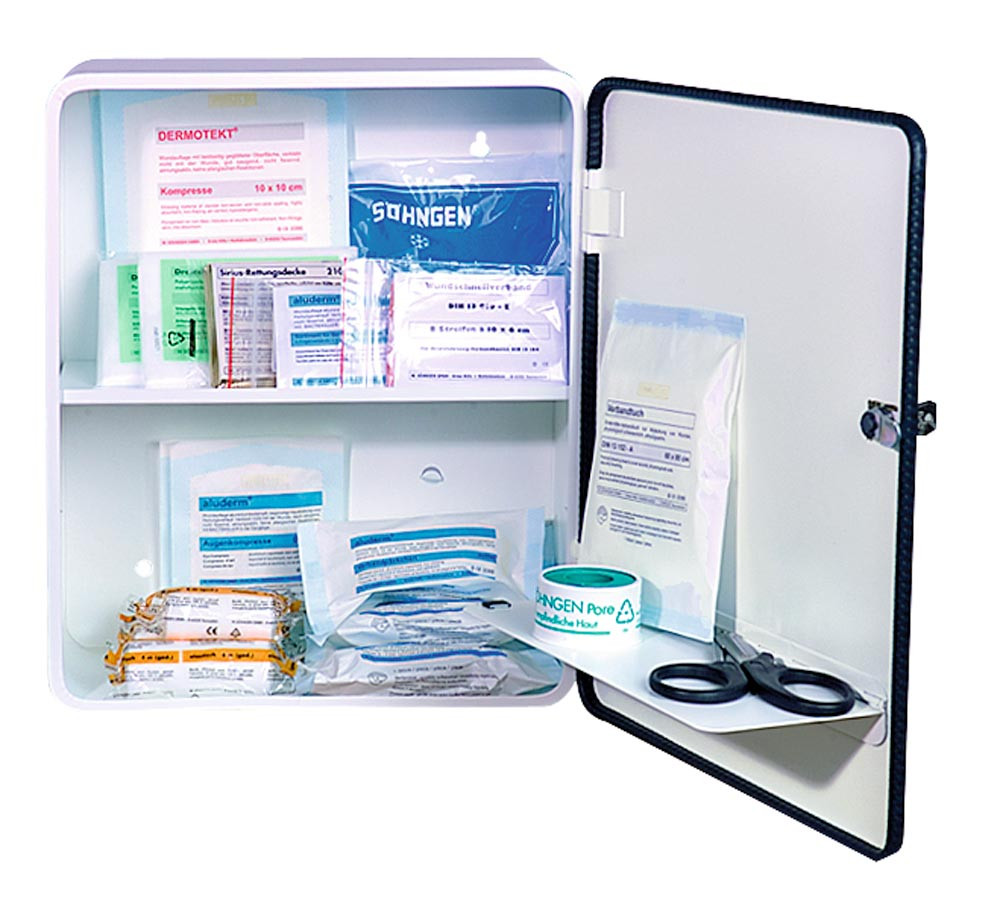 Ausführung: Komplett mit Füllung nach DIN 13157 ∙ Aus Qualitäts-Stahlblech, weiß lackiert ∙ Sicherheitsschloss mit 2 Schlüsseln ∙ Siebdruckbeschriftung und Farbpiktogramme ∙ Aufhängevorrichtung ∙ Erweiterbar mit z. B. Medikamentenfach, zusätzlichem Einlegeboden ∙ Tür mit klappbarem Ablagetableau zur hygienischen Zwischenlagerung von Verbandmaterial bei der Erste-Hilfe-Leistung