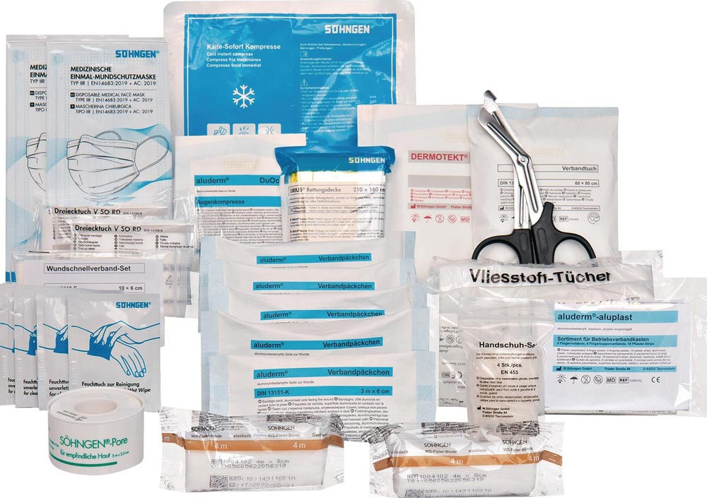 Sterile Verbandstoffe von SÖHNGEN® für Verbandschränke, Erste-Hilfe-Koffer klein + groß sind mit einem Herstellungsdatum und einem Haltbarkeitsdatum von 20 Jahren ab Herstellung versehen. · Der Inhalt entspricht den Mindestanforderungen nach DIN 13157 hinsichtlich Ausführung und Qualität.