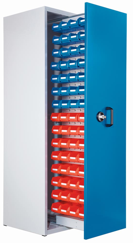 Vertikalauszugschränke mit Schlitzplatten, BxTxH 590x600x2000 mm, RAL 7035 / RAL 5010, inkl. Sichtlagerkästen (60 Stück Größe 7)