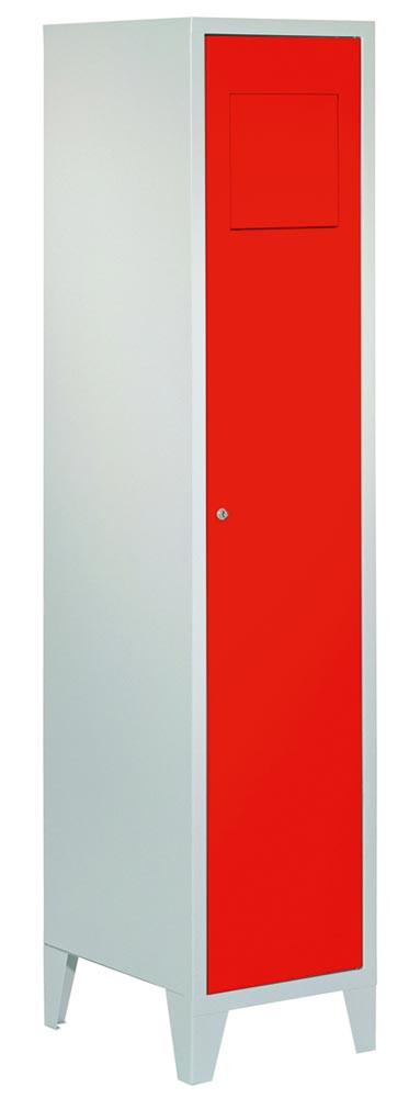 Wäschesammelschrank, Füße, Einwurfklappe, 7 Haken für Wäschesack, Zylinderschloss, BxTxH 400x500x1850 mm, RAL 7035/3000 E1566699