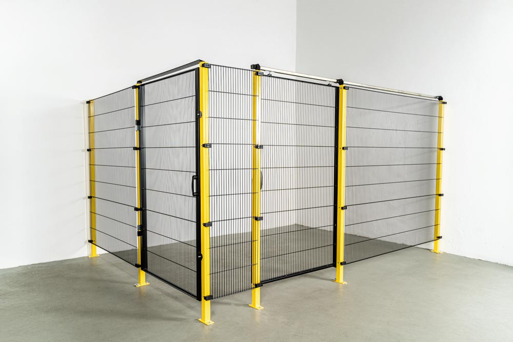 · Maschung gegen Durchgreifen: 19 x 200 mm · Entspricht der EN ISO 13857 n Nach Maschinenschutzrichtlinie 2006 / 42 / EG · Aufbauhöhe 2000 mm, 175 mm Fußluft · Pfosten pulverbeschichtet RAL 1018 Zinkgelb und Gitter RAL 9005 Tiefschwarz · Weitere Farben auf Anfrage möglich