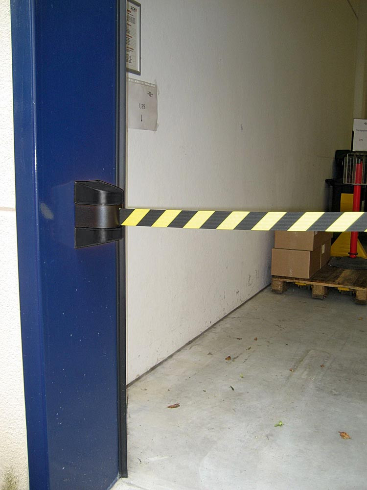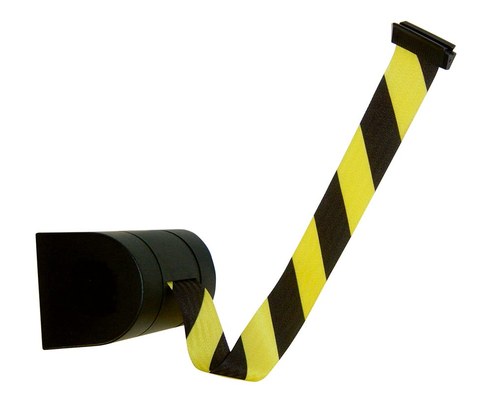 Wandkassette mit Rollgurt, Wandfixierung inkl. Wandanschluss, Gehäuse Kunststoff schwarz, Gurt 9 m, gelb/schwarz