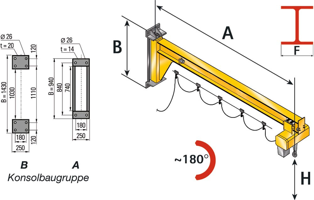 Wandschwenkkran, ohne Elektrokettenzug, Traglast 500 kg, Konsolbaugruppe B, Schwenkbereich 180 Grad, Ausladung 5000 mm