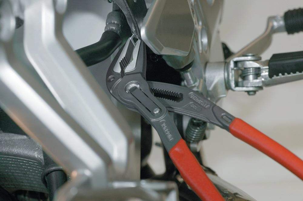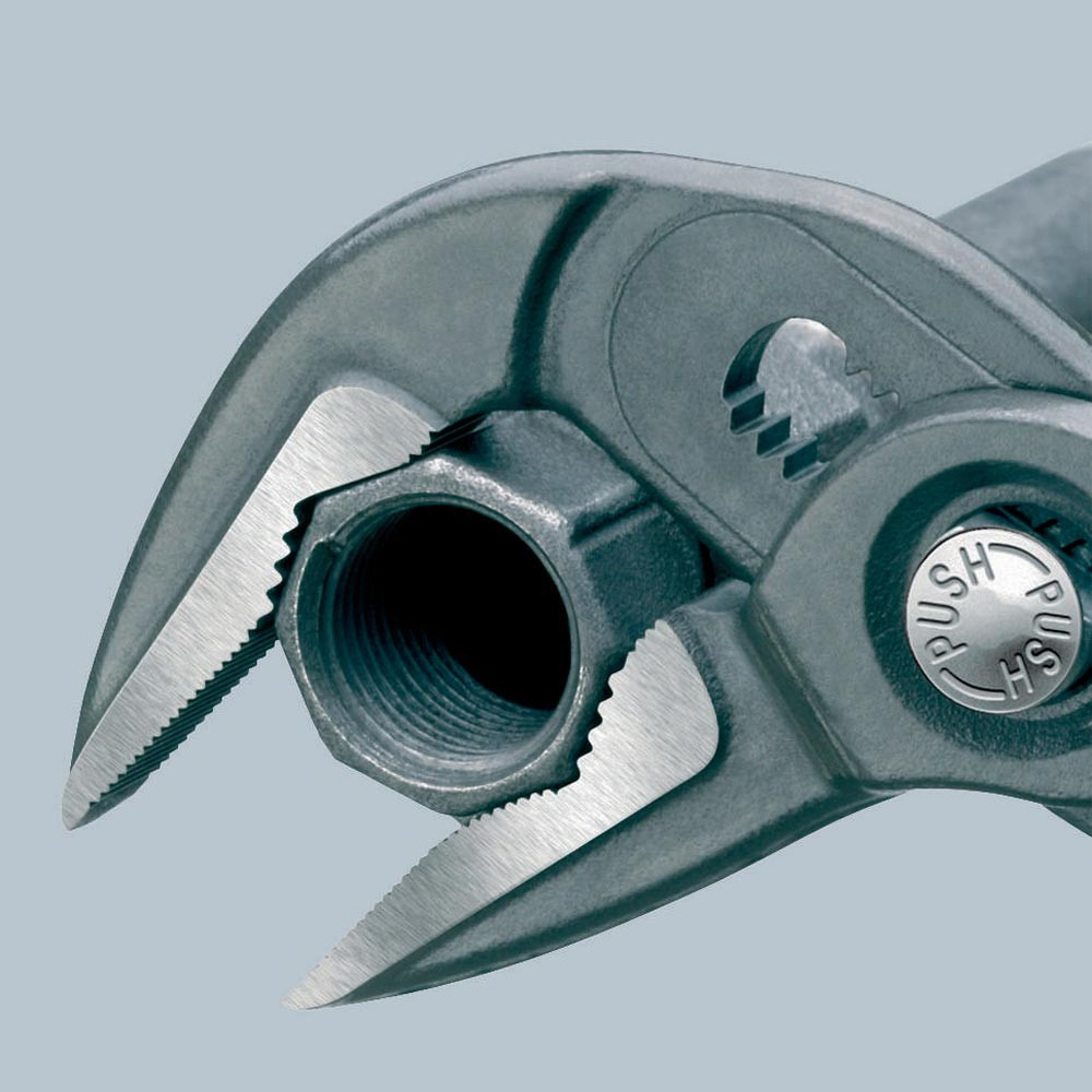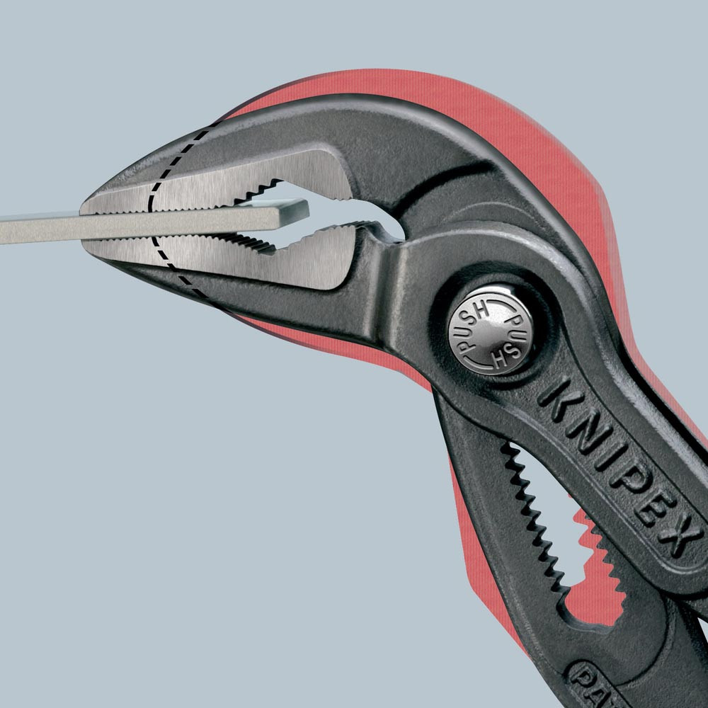 selbstklemmend an Rohren und Muttern · durchgestecktes Gelenk · Einstellung per Knopfdruck direkt am Werkstück · besonders guter Zugang zum Werkstück durch sehr schlanke Bauform im gesamten Kopf- und Gelenkbereich · ideal für Service und Instandhaltung, Gerätereparatur, Fahrzeugbau und Industrie · Klemmschutz · Chrom-Vanadin-Elektrostahl, geschmiedet, mehrstufig ölgehärtet