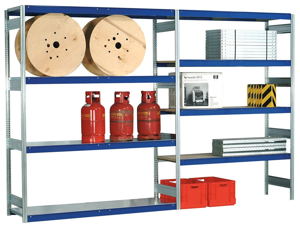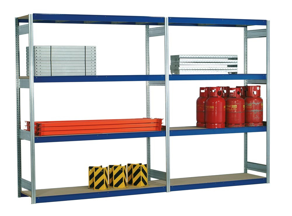 Weitspannregal, Anbaufeld, 4 Lagerebenen mit Spanplattenboden, BxTxH 1750x500x2000 mm, Rahmen verzinkt, Traversen blau, Fachlast 400 kg E872803