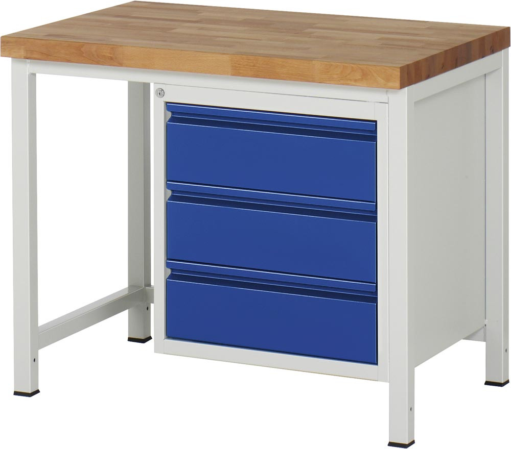 Werkbank, BxTxH 1000x700x840 mm, Platte Buche 40 mm, 3 Schubladen 180 mm, RAL 7035/5010 E1978801
