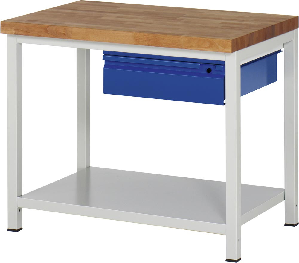 Werkbank, BxTxH 750x700x840 mm, Platte Buche 40 mm, inkl. Stahlblech-Ablageboden, 1x 150 mm Hängeschublade, RAL 7035/5010 E1978795