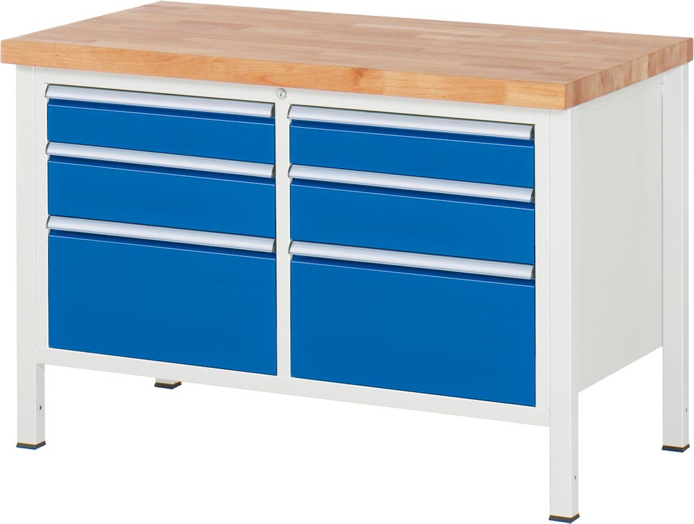 Werkbank, BxTxH 1250x900x840-1040 mm, 6 Schubladen: 2x120/2x150/2x270 mm, Platte Buche 40 mm RAL 7035/5010 E6490750