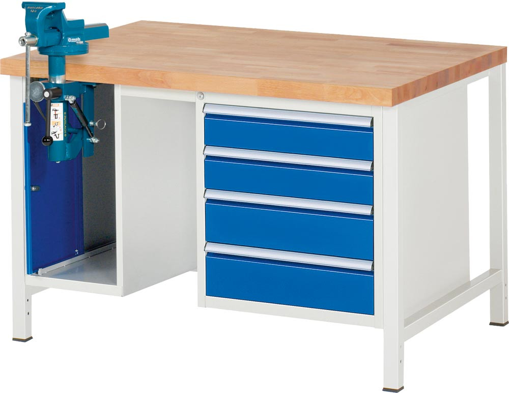 Werkbank, BxTxH 1250x700x840-1040 mm, Platte Buche, 4 Schubl.: 2 x 120/2 x 150 mm, 1 Schraubstockschrank, Schraubstock m. Klapplift, RAL7035/5010 E6490687