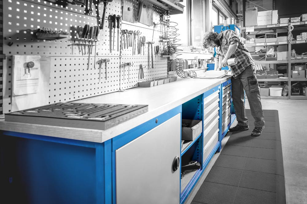 · Stabile Stahlkonstruktion · Multiplex-Buchenholzplatte mit Plattenstärke 40 mm · Schubladenvollauszug (VA) 100 % · Schubladentraglast 100 kg · · Zylinderschloß mit 2 Schlüsseln · Gesamtbelastung 1000 kg