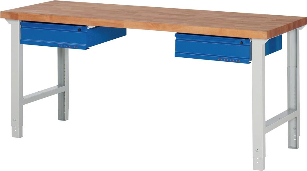 Werkbank Serie BK 650 B2000xT700xH790-1140mm Buche massiv lichtgrau / enzianblau 2 Schubladen E6497666