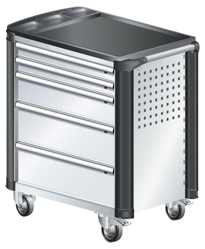Werkstattwagen, 5 Schubladen: 2x75, 1x150, 2x200 mm VA, BxTxH 894x525x928 mm, Kunststoffabdeckung, Kantenschutz, fahrbar, RAL 7035