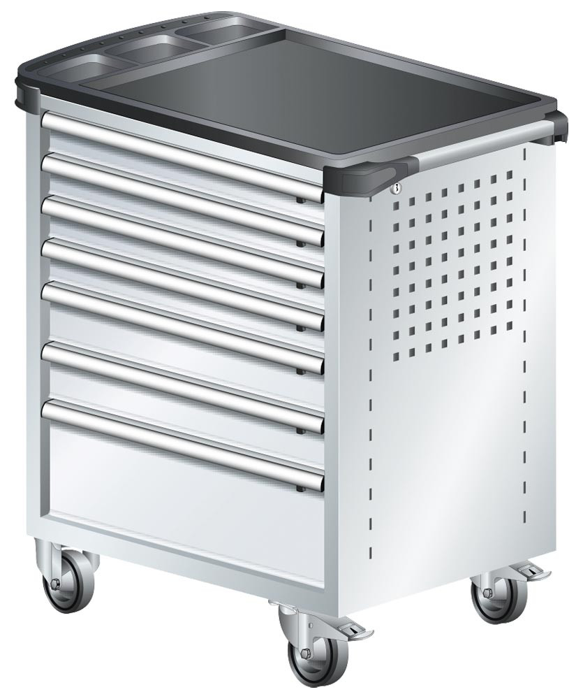Werkstattwagen, 7 Schubladen: 4x75, 2x100, 1x200 mm VA, BxTxH 894x525x928 mm, Kunststoffabdeckung, fahrbar, RAL 7035