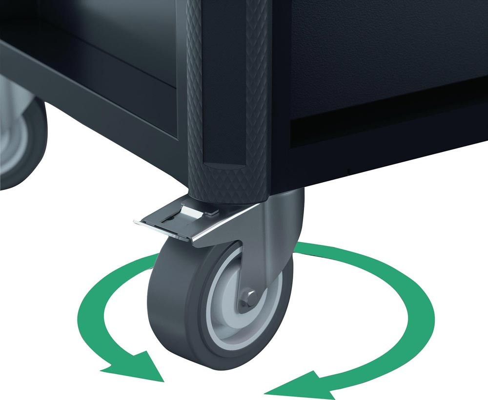 komplett mit 78-teiligem Werkzeugsortiment · 7 Schubladen (5 flache und 2 hohe) · 100 %iger Schubladen-Auszug mit kugelgelagerten Teleskopschienen, Selbsteinzug · minimales Kipprisiko durch Auszugsperre (nur eine Schublade kann geöffnet werden) · doppelwandige Ausführung · Vierkantlochung beidseitig