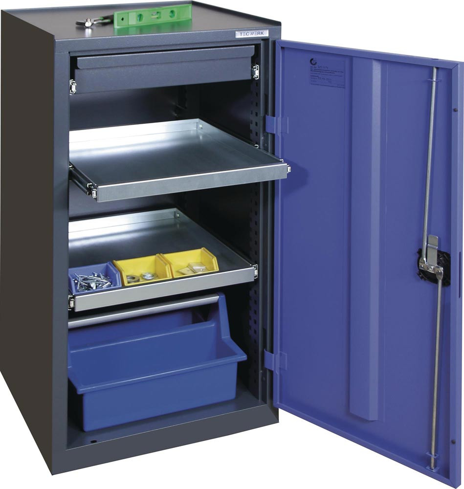 Stahlblechkonstruktion mit widerstandsfähiger Pulverbeschichtung · ausgestattet mit Schubladen und herausziehbaren Fachböden, mit allseitigem Rand, Höhe 30 mm, auf kugelgelagerten Präzisionsauszügen, 100 % ausziehbar · Schubladen, H 100 mm und Fachböden im 25-mm-Raster höhenverstellbar · Tragfähigkeit pro Fachboden/Schublade 35 kg · obere Ablage mit Abrollrand · Flügeltür abschließbar mit Zylinderschloss und Drehriegelverschluss mit 3-Punkt-Verriegelung