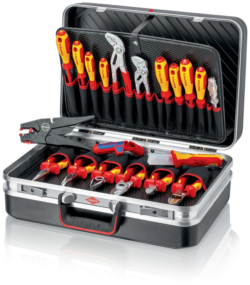 für die Elektroinstallation · umlaufender Doppel-Aluminiumrahmen · Rasterscharniere, die als Deckelhalter funktionieren · stabiler, ergonomischer Tragegriff · 2 abschließbare Kippschlösser · 1 herausnehmbare Werkzeugtafel im Deckel mit 15 Werkzeugtaschen auf der Bodenseite und 6 großen Werkzeugtaschen sowie einem Klemmfach (400 mm breit) auf der Deckelseite · durch flexible Einsätze unterteilbar und Abdecktafel mit 6 großen Werkzeugtaschen · Belastbarkeit bis 20 kg · Abmessungen, außen (B 480 x H 175 x T 70 mm) · Abmessungen, innen (B 415 x H 180 x T 365 mm) · bestückt mit 20 Markenwerkzeugen, teilweise VDE-geprüft nach DIN EN 60900 · Bestehend aus: